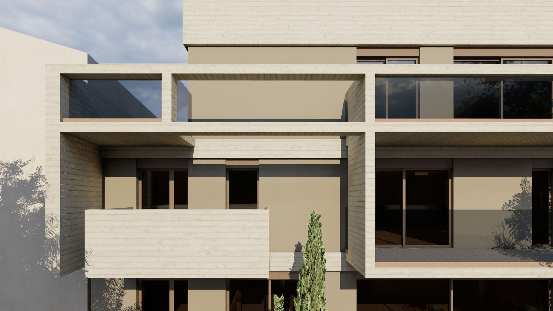 The architectural expression is further enhanced by a suspended concrete “box”, projecting from the main volume and hosting balconies, sun-shading devices, and layered screens. These horizontal elements form a dynamic façade articulation, contrasting and complementing the vertical massing, while also contributing to the project’s bioclimatic strategy.