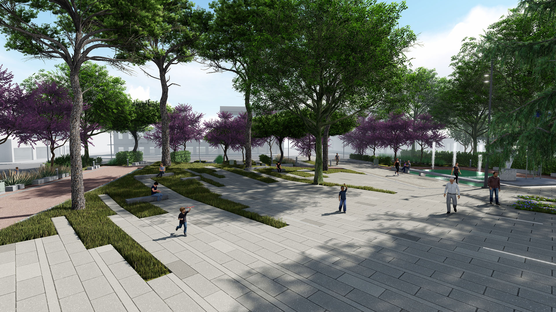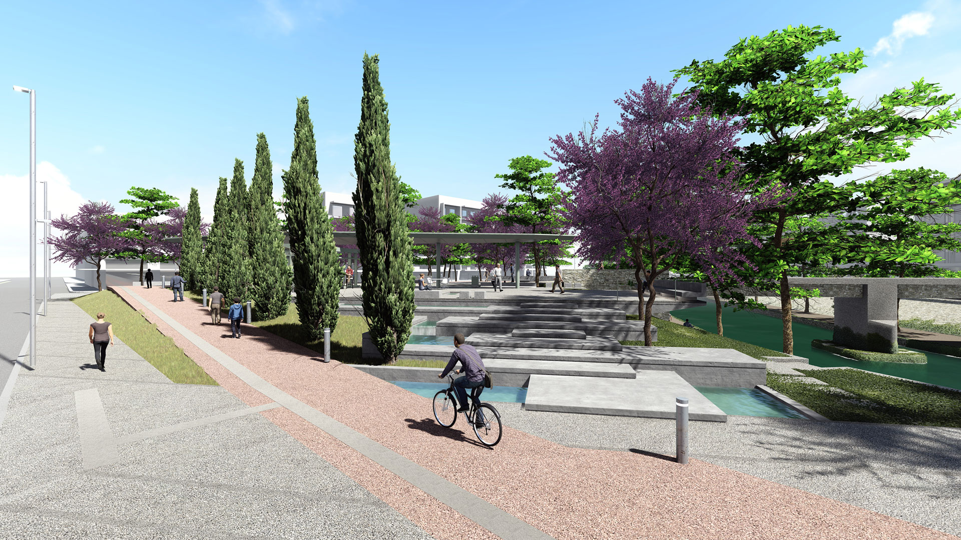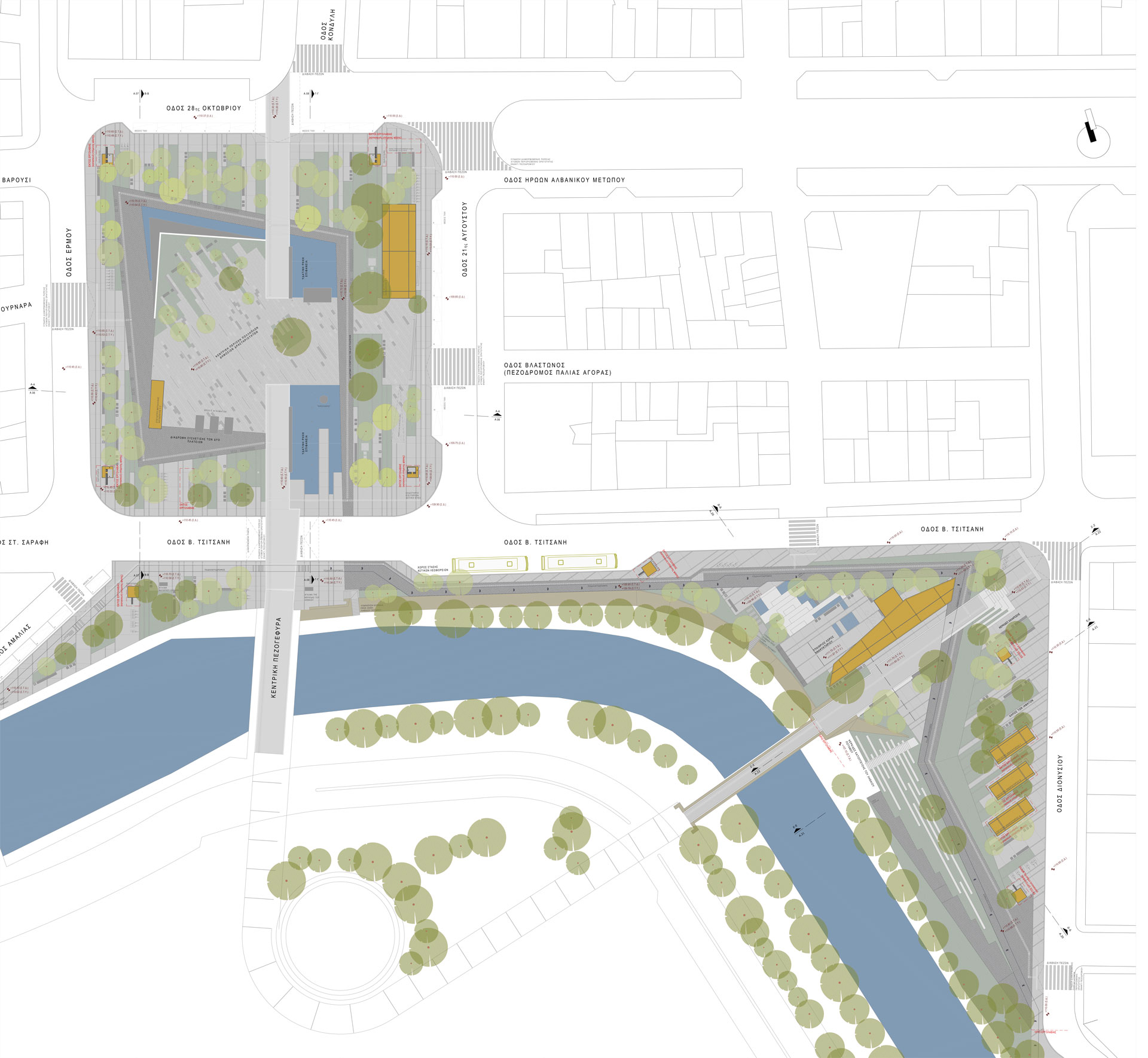 Η νέα διαμόρφωση περιλαμβάνει δενδροφύτευση μεσογειακών ειδών και μικρά υδάτινα στοιχεία για βιοκλιματική ανακούφιση, περιοχές σκίασης, καθιστικά, αμφιθεατρική πλατεία και ευθείες διαμπερείς κινήσεις.