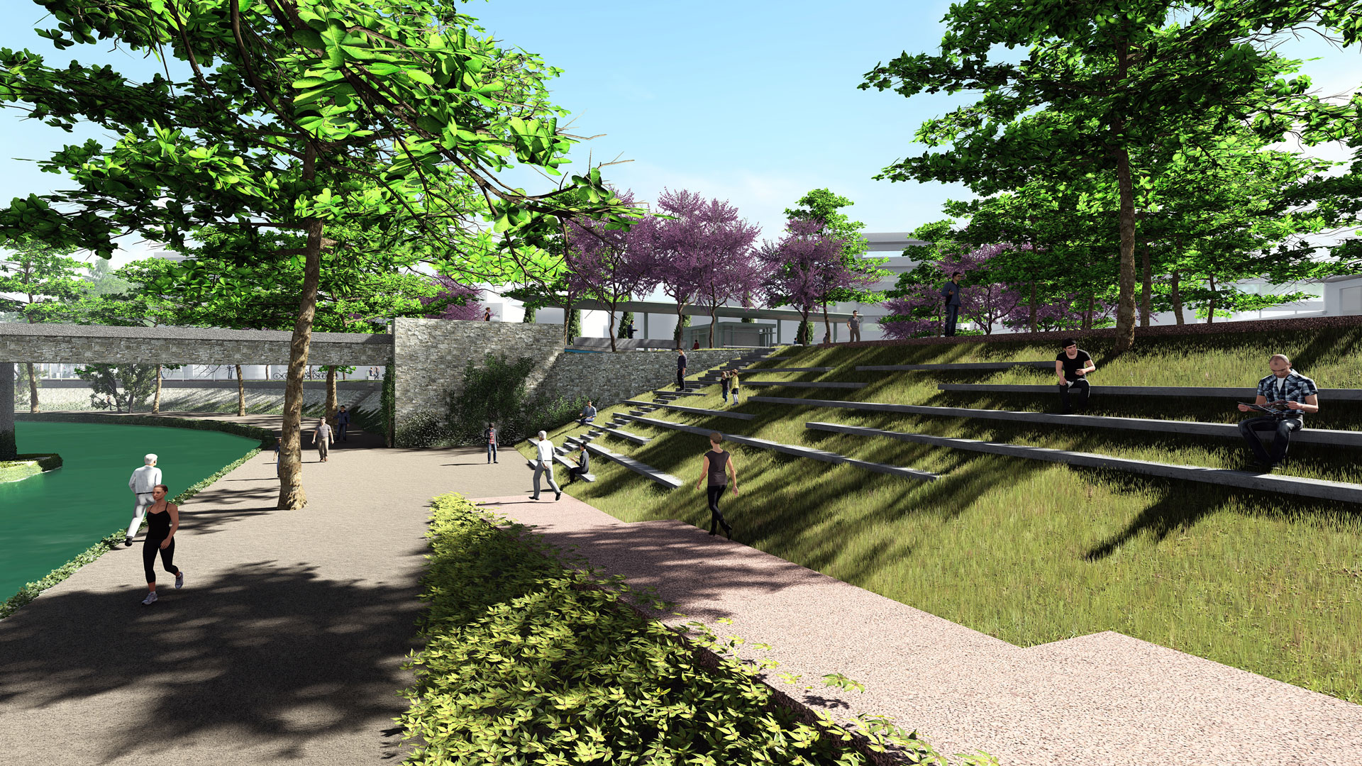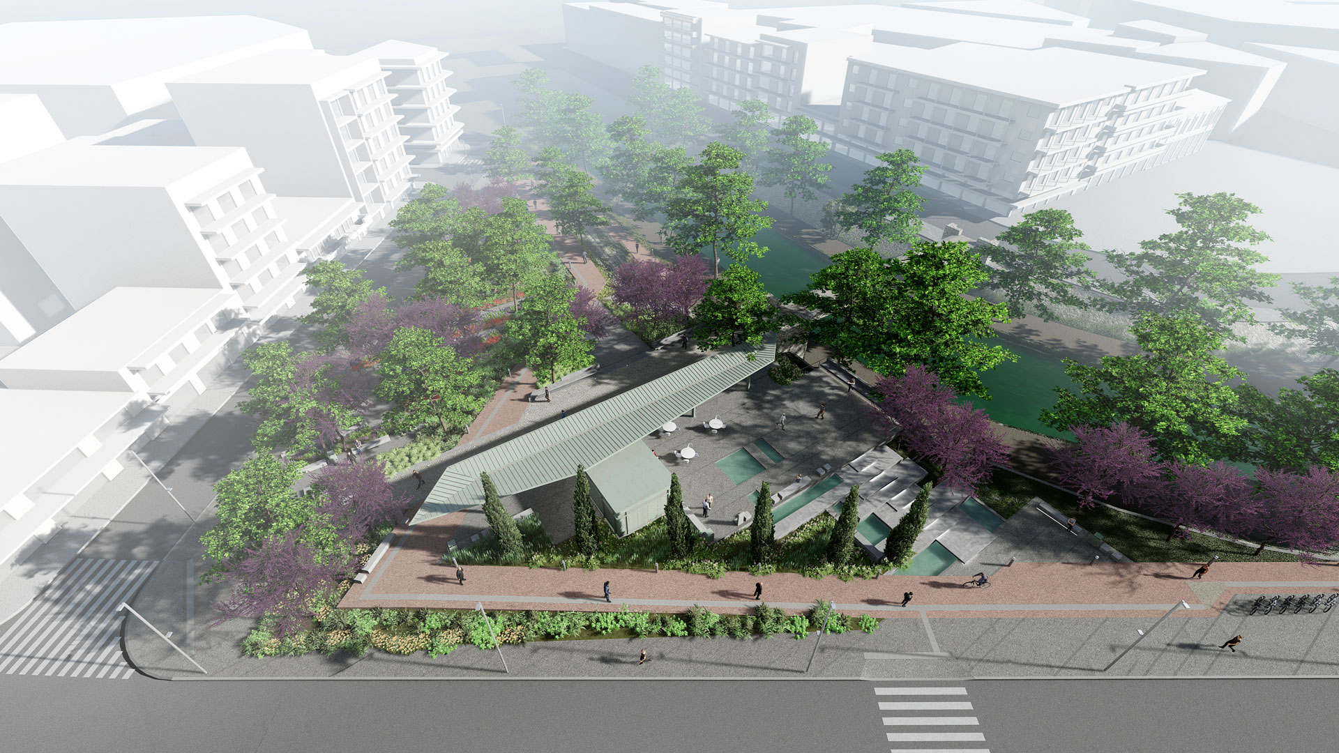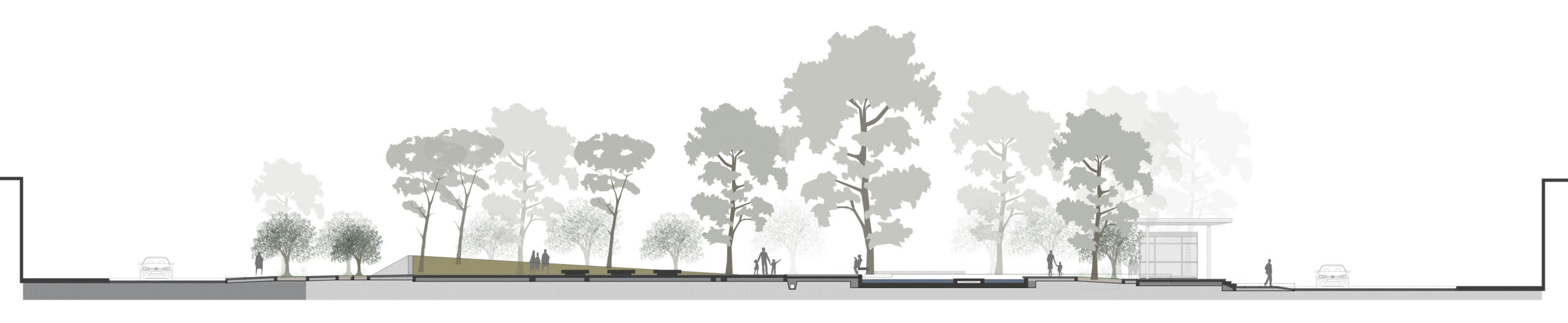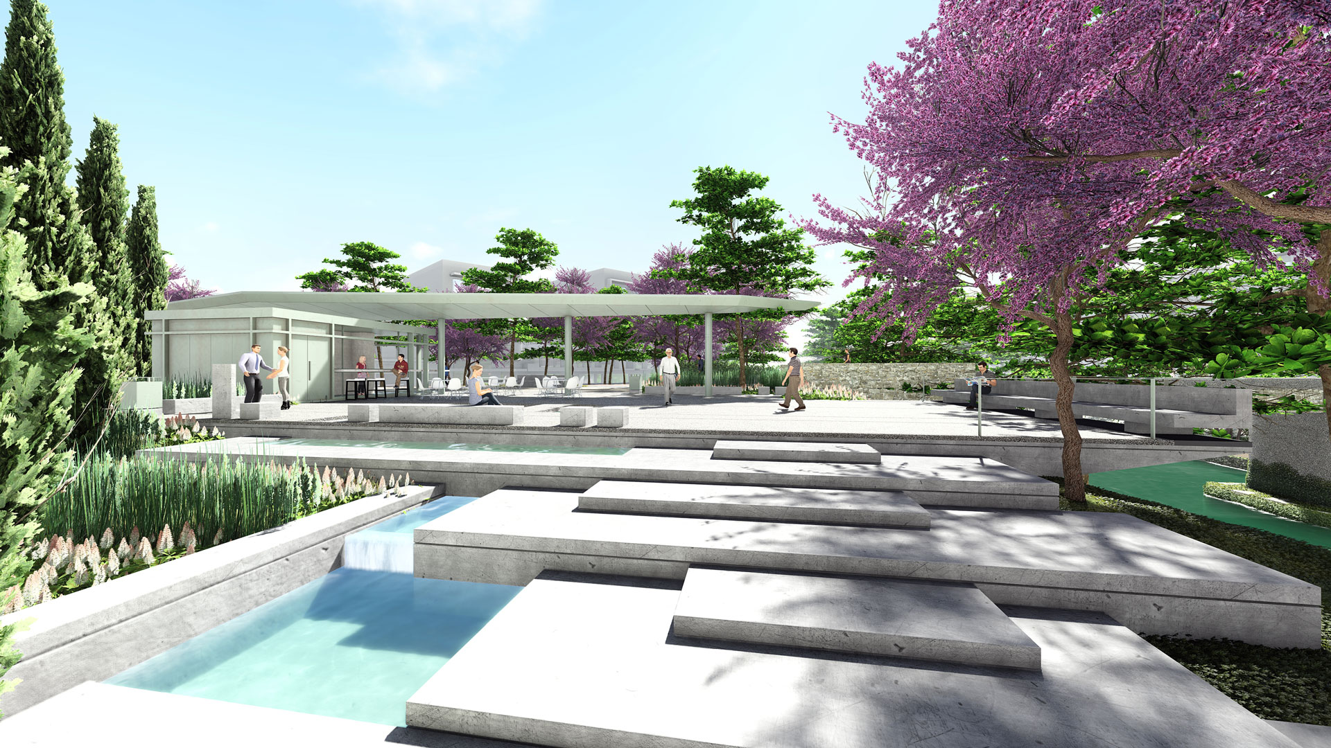 Η νέα διαμόρφωση περιλαμβάνει δενδροφύτευση μεσογειακών ειδών και μικρά υδάτινα στοιχεία για βιοκλιματική ανακούφιση, περιοχές σκίασης, καθιστικά, αμφιθεατρική πλατεία και ευθείες διαμπερείς κινήσεις.