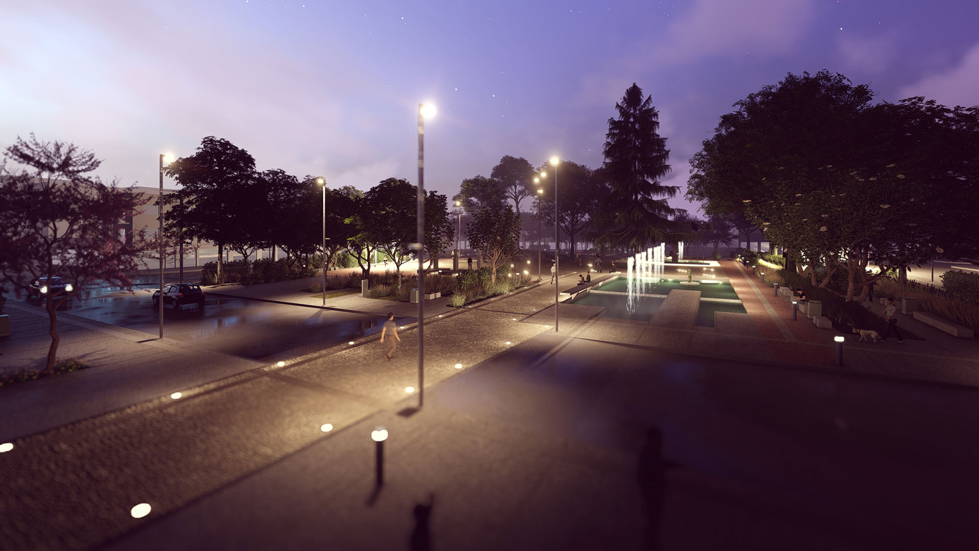 Η πρόταση επαναφέρει τη γεωμετρία της αρχικής πλατείας και επιδιώκει τον μετασχηματισμό του υφιστάμενου επιπέδου ώστε να αποκαταστήσει τη σχέση με τα γύρω σημαντικά δημόσια κτίρια και να ενισχύσει τη συνέχεια με την Πλατεία Εθνικής Αντίστασης, λειτουργώντας ως καταλύτης ενοποίησης του δημόσιου χώρου και επανασύνδεσης του αστικού ιστού.
