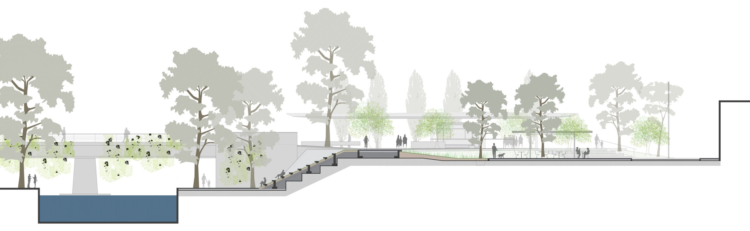 Η πρόταση για τον σχεδιασμό της Πλατείας Εθνικής Αντίστασης καθορίζεται από τη διαμόρφωση μιας υπερυψωμένης πλατείας, ενός belvedere, συσχετισμένου με την τοποθέτηση ενός μικρού αναψυκτήριου. Η πλατεία ορίζεται από χαμηλούς τοίχους και φυτεύσεις, παρέχει πανοραμική θέα προς την Πλατεία Ηρώων Πολυτεχνείου και τον ποταμό, και διαμορφώνεται με ήπιες μεταβάσεις υψομέτρου και αστικές πέργκολες για σκίαση.