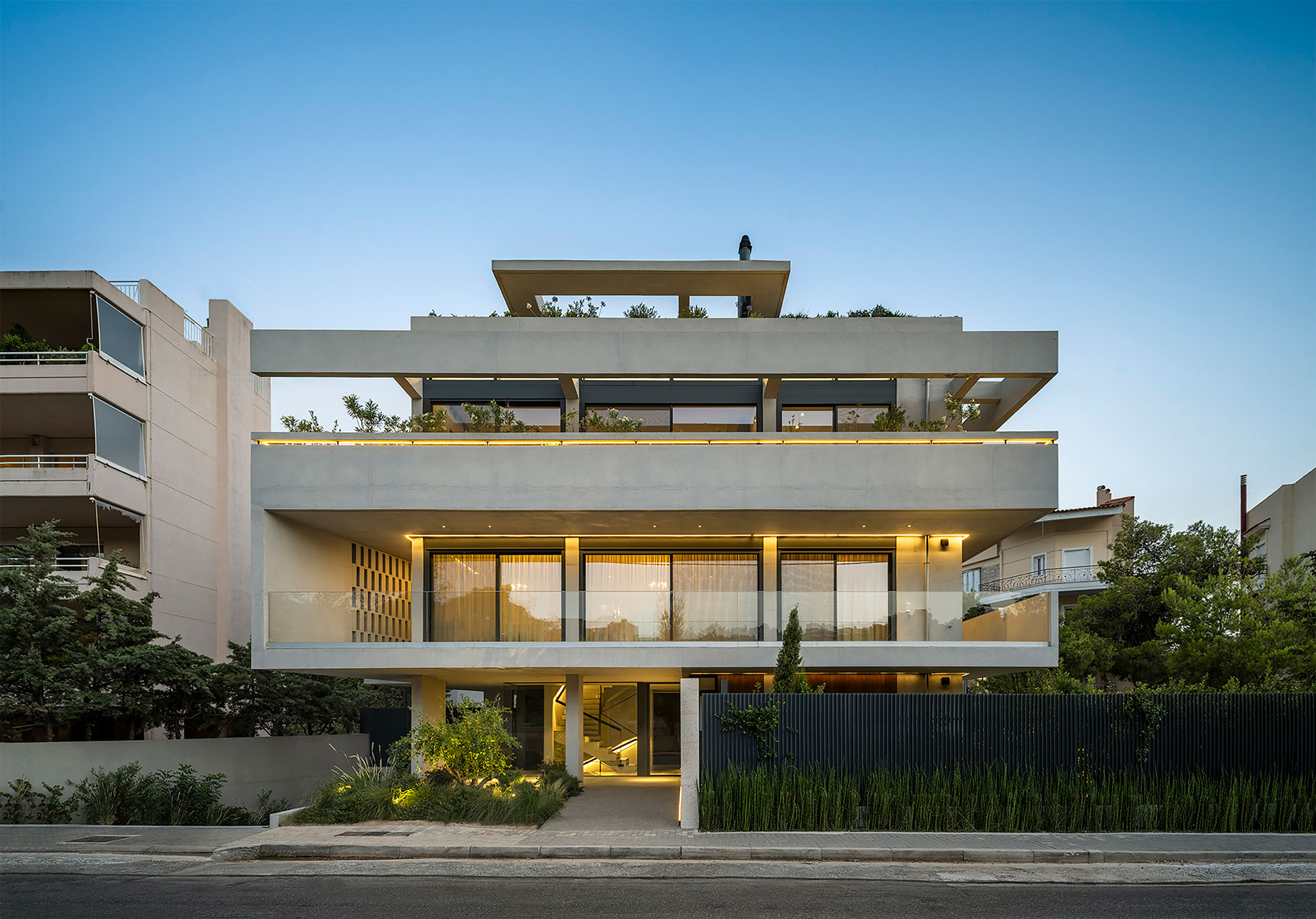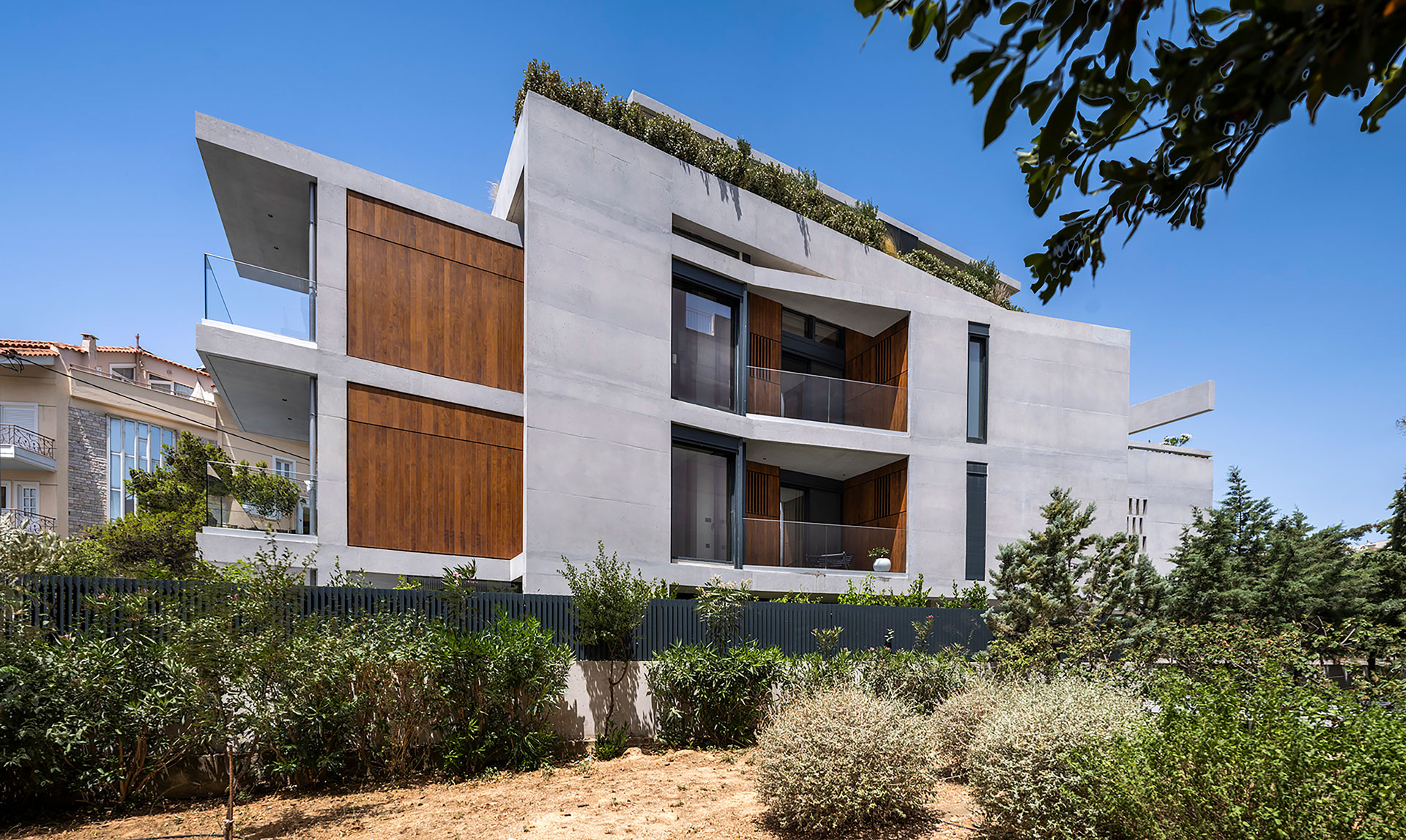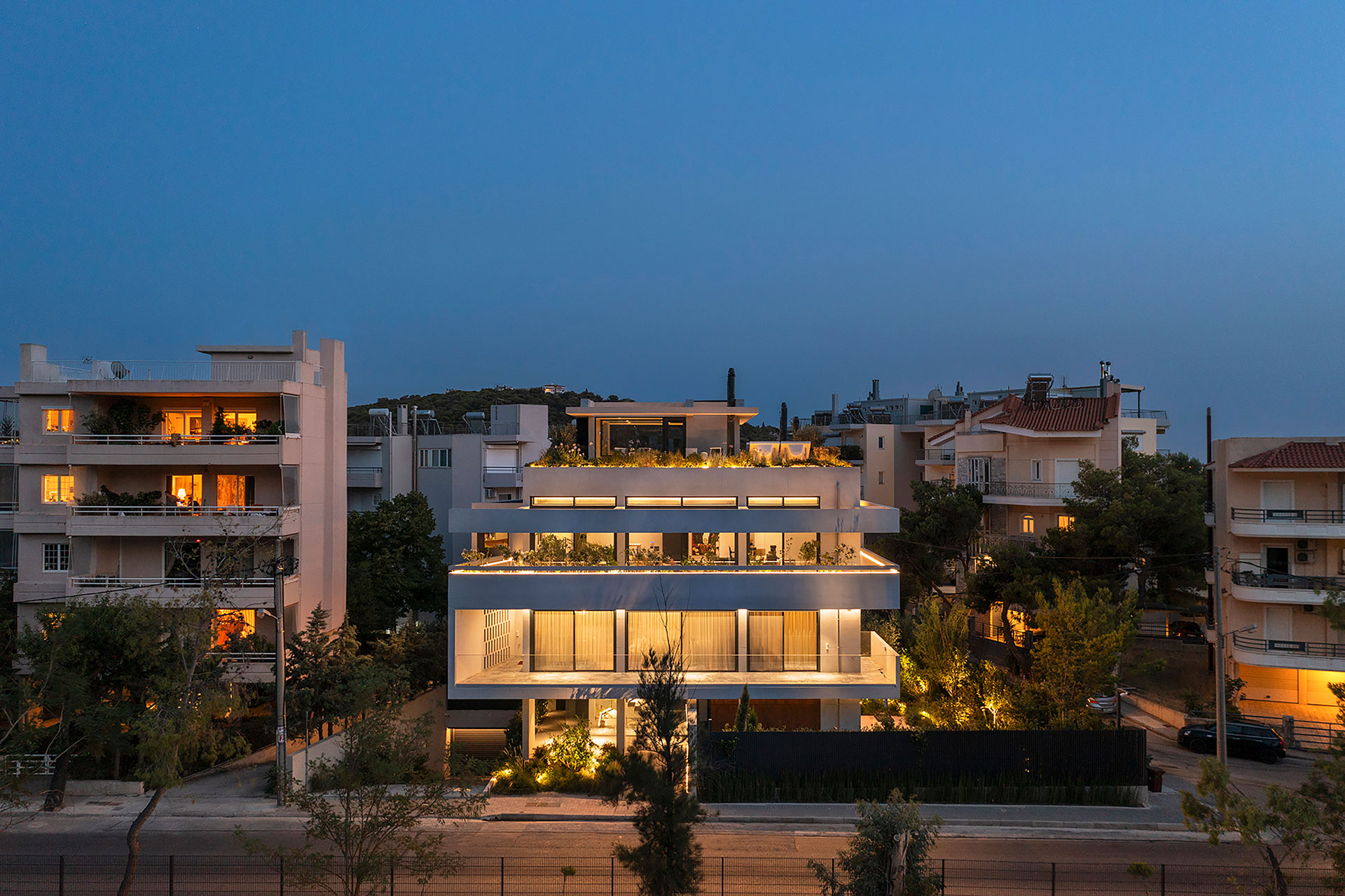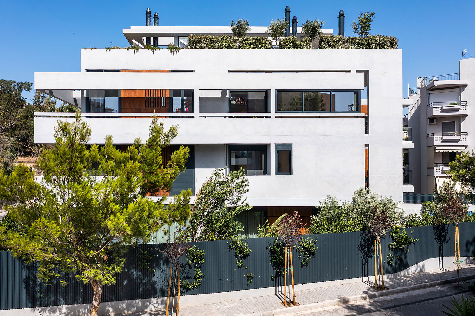 Η εσωτερική ζωή επεκτείνεται σε υπαίθριους και ημιυπαίθριους χώρους, με κοινόχρηστο δώμα που διαμορφώνεται με εκτεταμένες φυτεύσεις, καθιστικό και πέργκολα. Η ισόγεια pilotis που εξυπηρετεί την ομαλή μετάβαση από την πόλη στο εσωτερικό, ενισχύει τον συλλογικό χαρακτήρα της πολυκατοικίας.