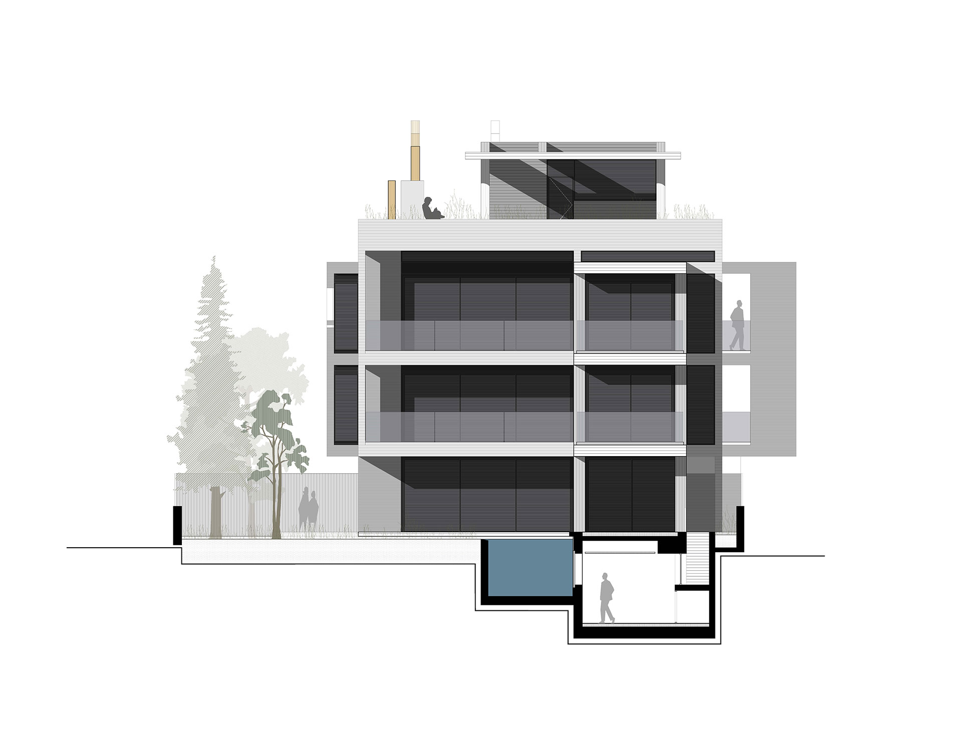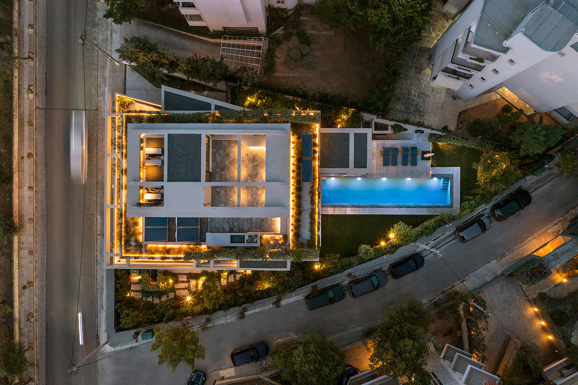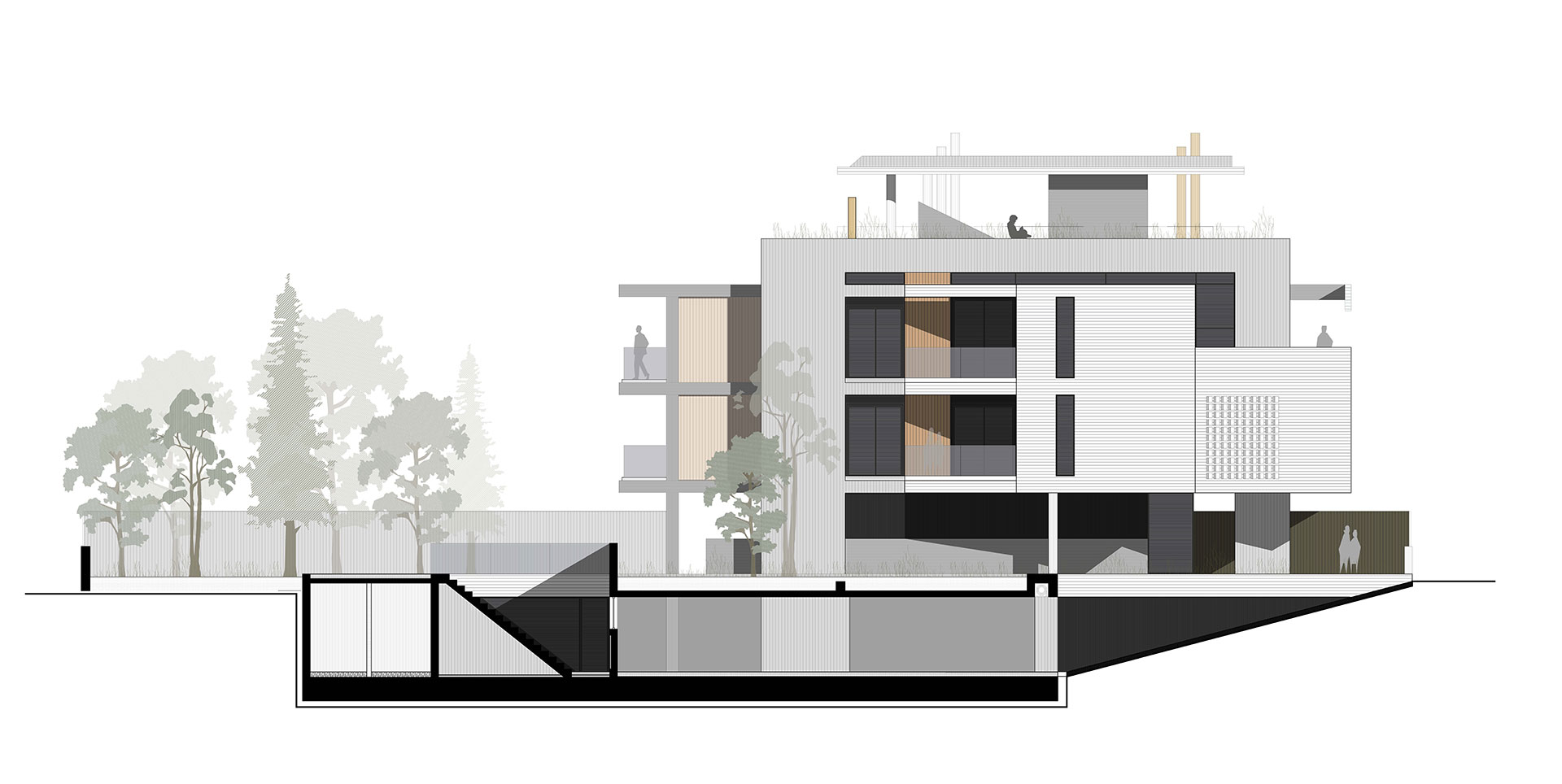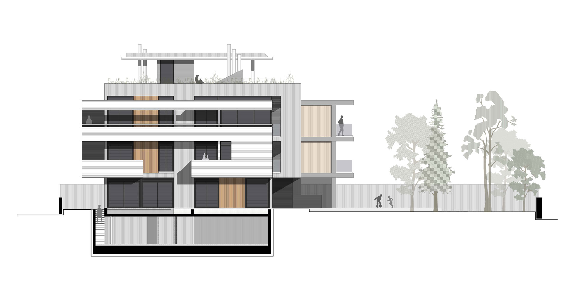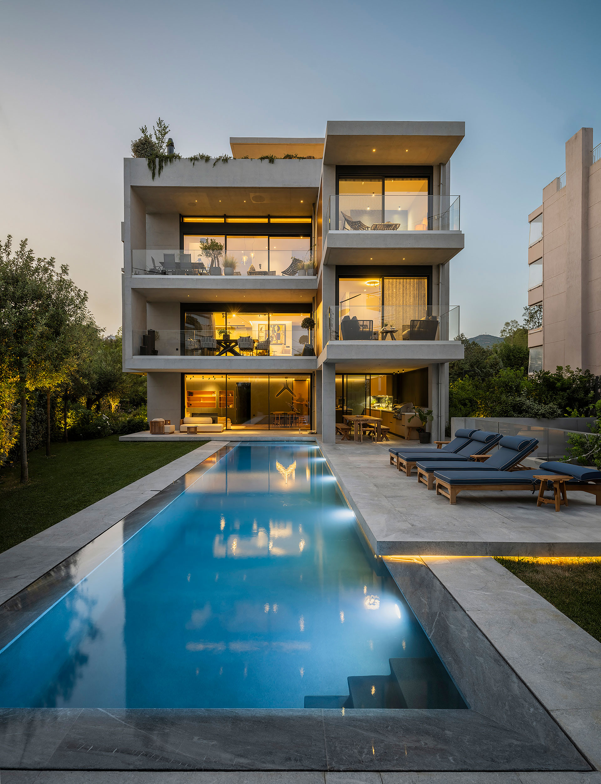 Η εσωτερική ζωή επεκτείνεται σε υπαίθριους και ημιυπαίθριους χώρους, με κοινόχρηστο δώμα που διαμορφώνεται με εκτεταμένες φυτεύσεις, καθιστικό και πέργκολα. Η ισόγεια pilotis που εξυπηρετεί την ομαλή μετάβαση από την πόλη στο εσωτερικό, ενισχύει τον συλλογικό χαρακτήρα της πολυκατοικίας.
