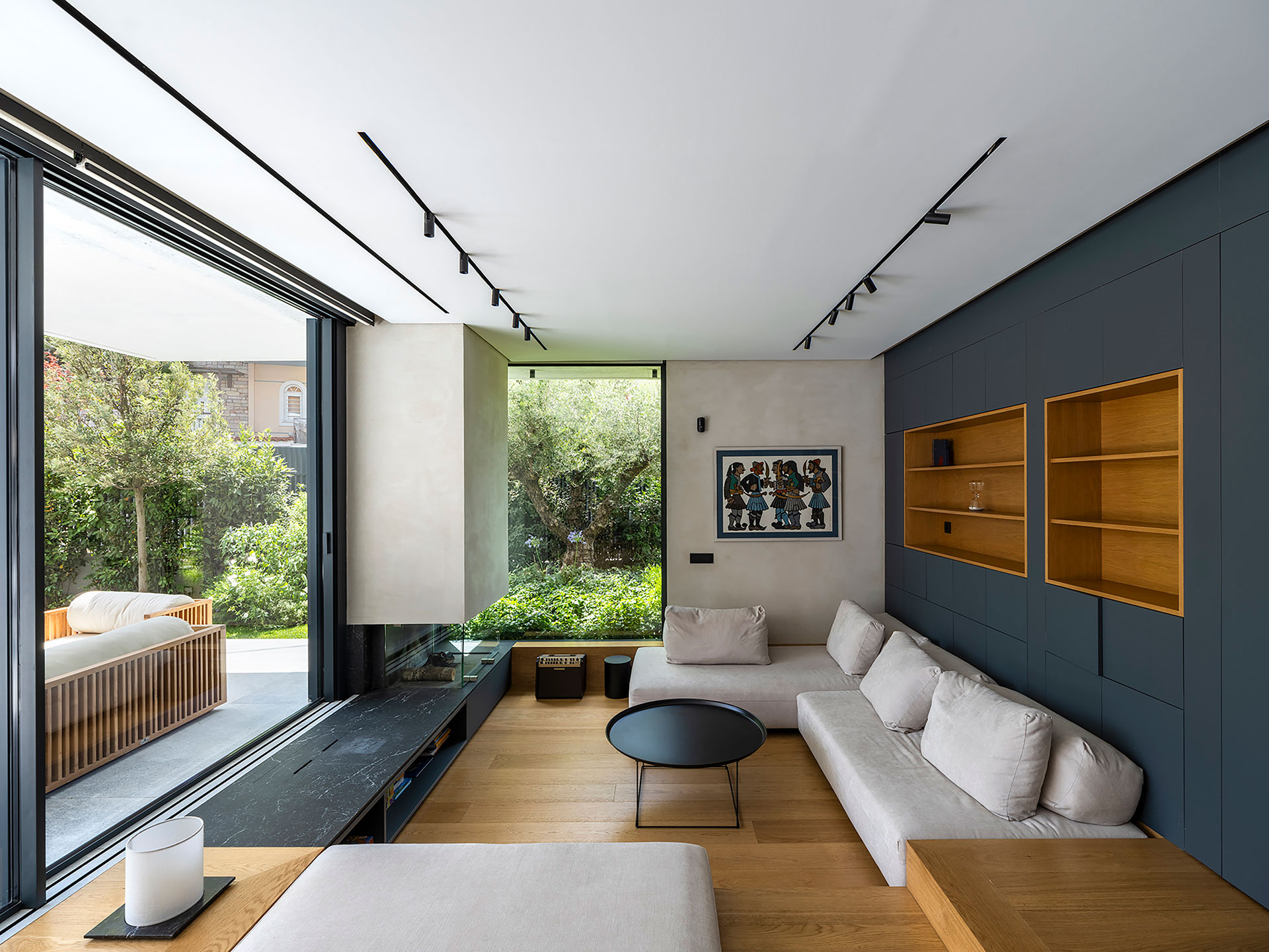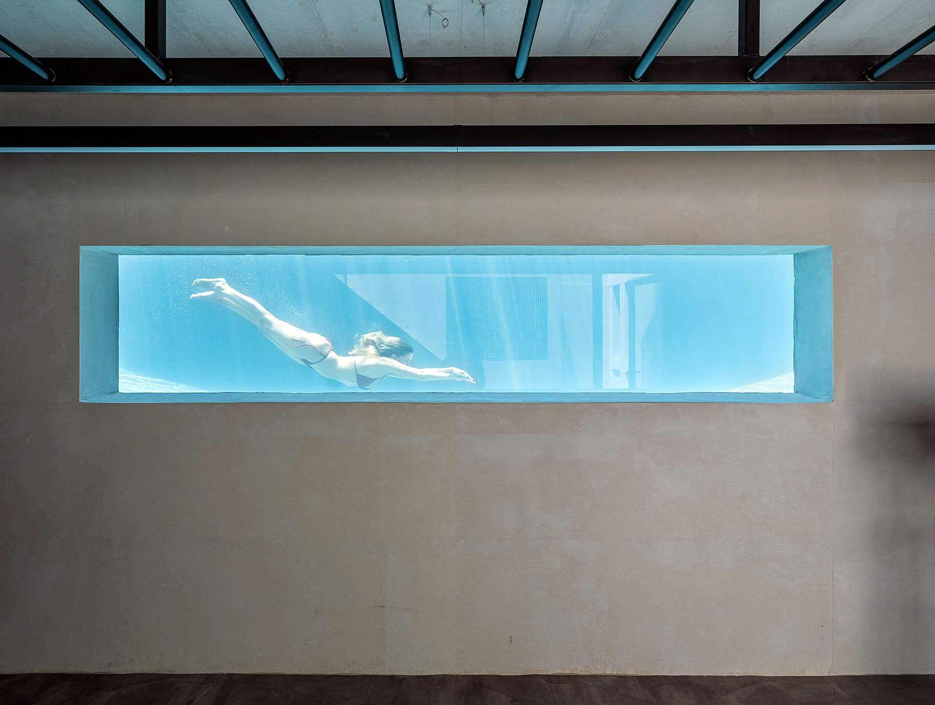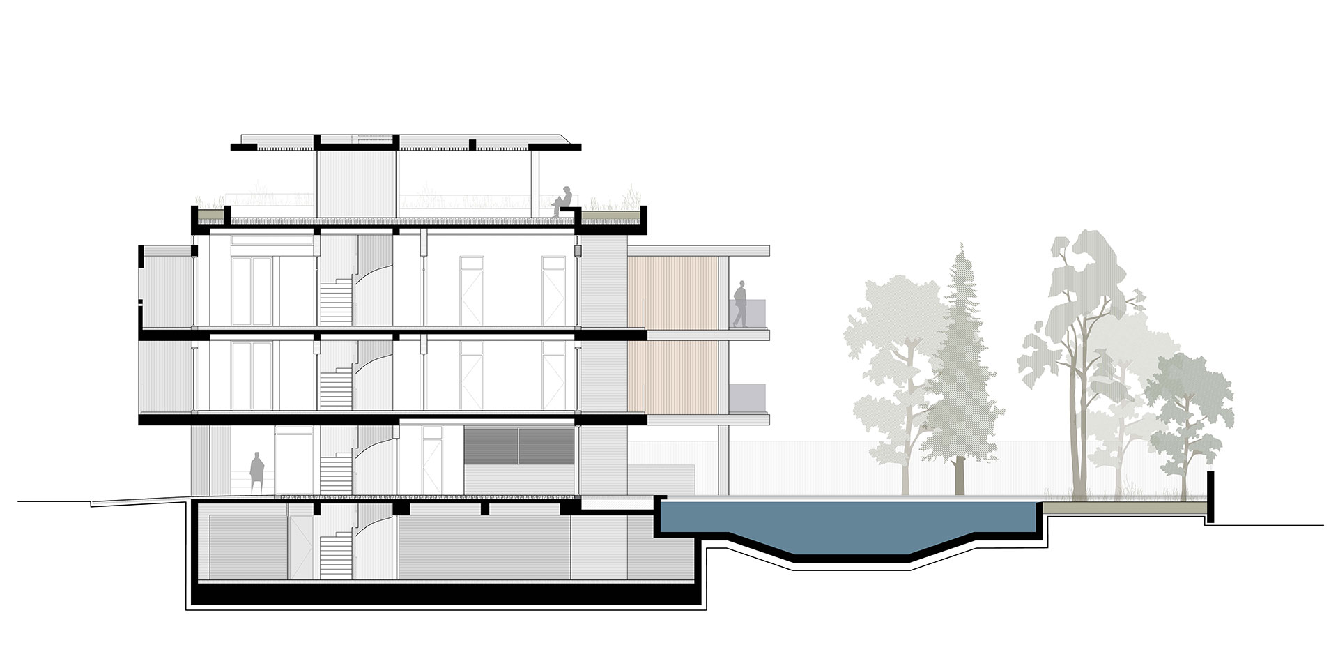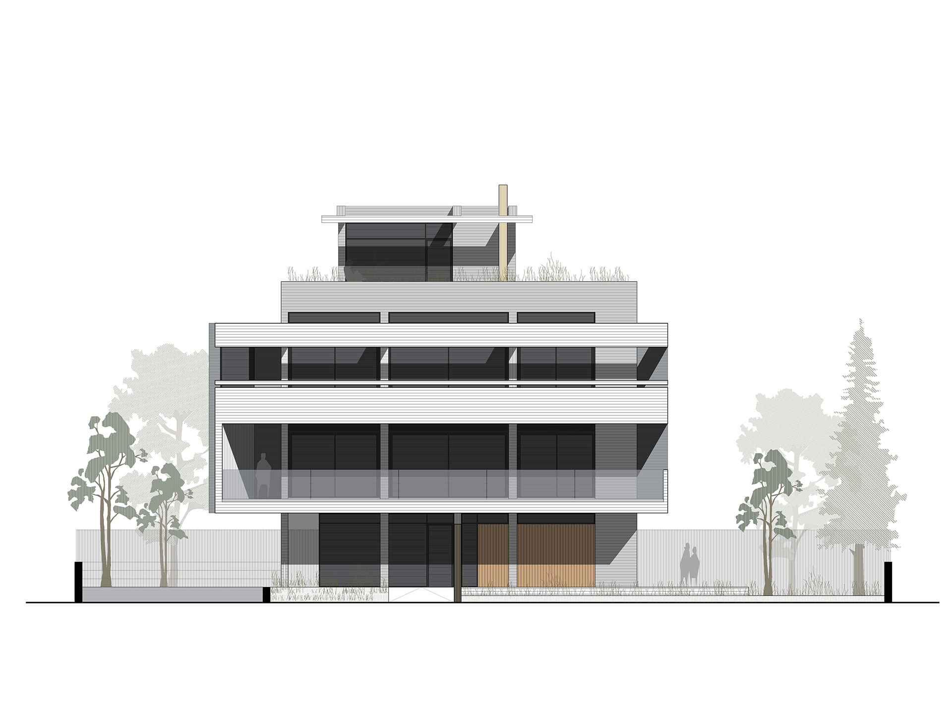 Η εσωτερική ζωή επεκτείνεται σε υπαίθριους και ημιυπαίθριους χώρους, με κοινόχρηστο δώμα που διαμορφώνεται με εκτεταμένες φυτεύσεις, καθιστικό και πέργκολα. Η ισόγεια pilotis που εξυπηρετεί την ομαλή μετάβαση από την πόλη στο εσωτερικό, ενισχύει τον συλλογικό χαρακτήρα της πολυκατοικίας.