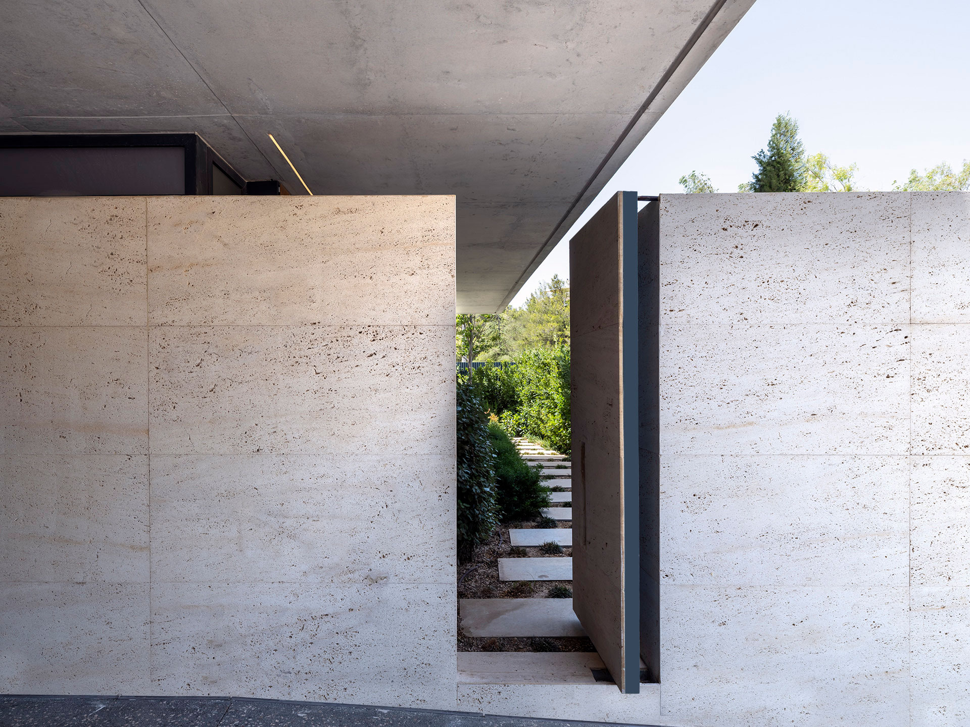 Το συγκεκριμένο αρχιτεκτονικό συντακτικό που ακολουθείται θέτει στο κέντρο του την κατασκευαστική λιτότητα, την καθαρότητα, τη σαφή δομική συγκρότηση του χώρου μέσα από βασικά συνθετικά δίπολα, καθαρά γεωμετρικά σχήματα και στερεά και την ευκρινή άρθρωση των μελών του. Βασική επιλογή αποτελεί η εκτεταμένη χρήση του ανεπίχριστου, άβαφου σκυροδέματος και η ανάδειξη του στατικού φορέα και των κατασκευαστικών δυνατοτήτων του. Η σύνθεση συμπληρώνεται από τοιχώματα εμφανούς σκυροδέματος σε δευτερεύοντα αρχιτεκτονικά στοιχεία, ξύλινες και μαρμάρινες επενδύσεις σε μη φέρουσες τοιχοποιίες και εκτενή υαλοστάσια.