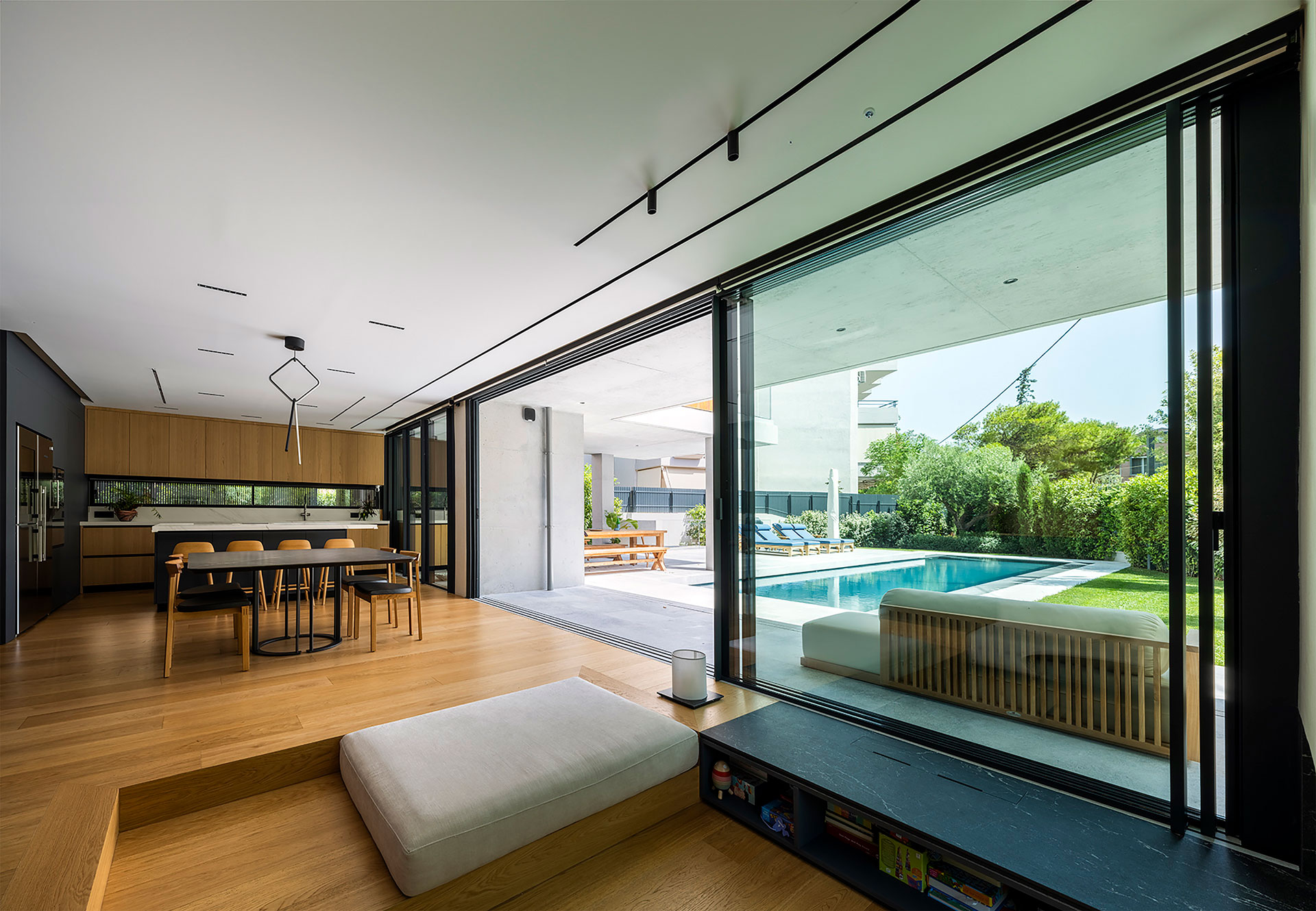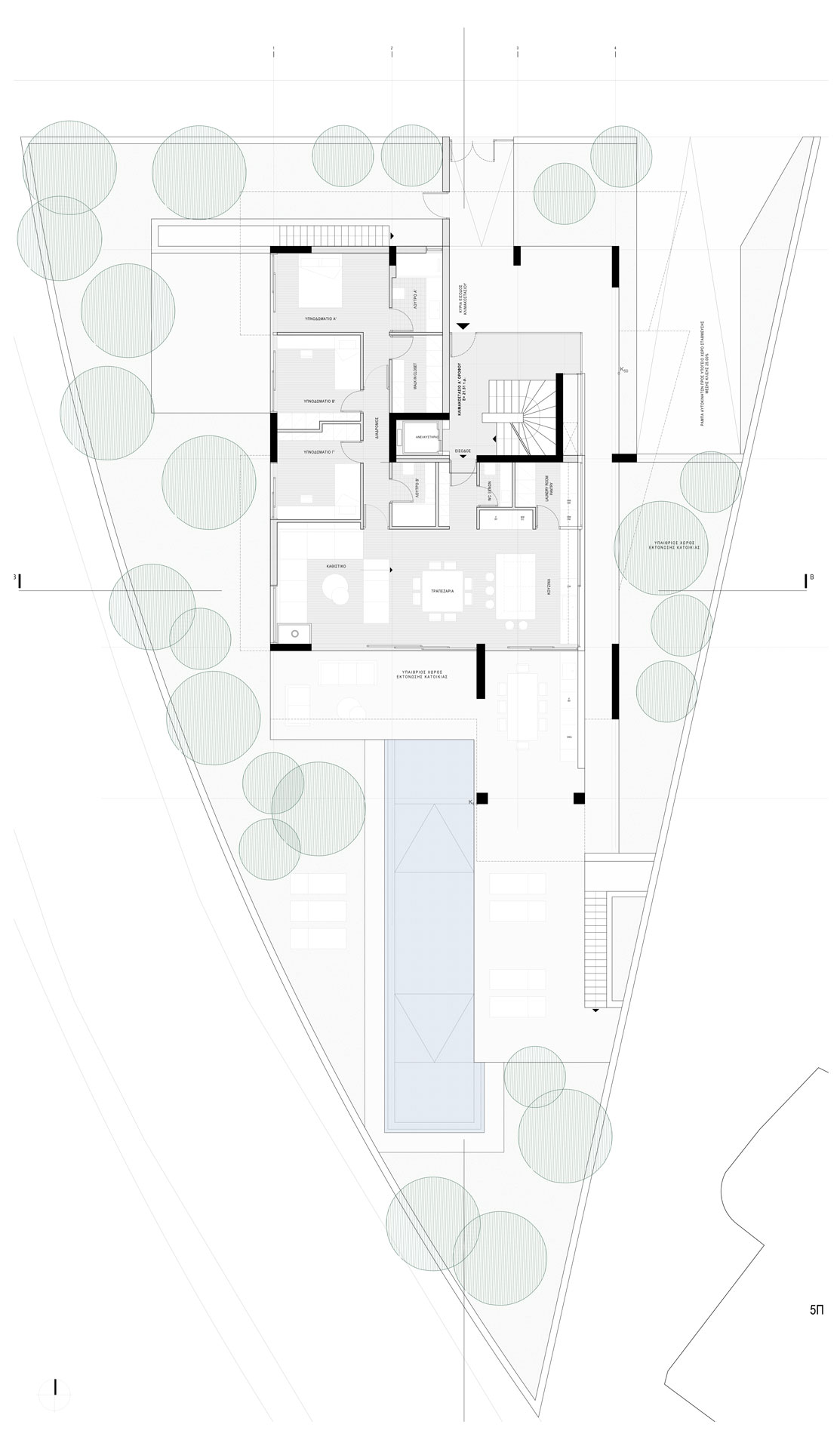 Η ισόγεια κατοικία, σε σχήμα Γ, αγκαλιάζει τον κατακόρυφο πυρήνα κινήσεων ώστε όλοι οι χώροι κύριας χρήσης να έχουν άμεση σχέση με το ύπαιθρο, τη φύτευση και την κολυμβητική δεξαμενή.