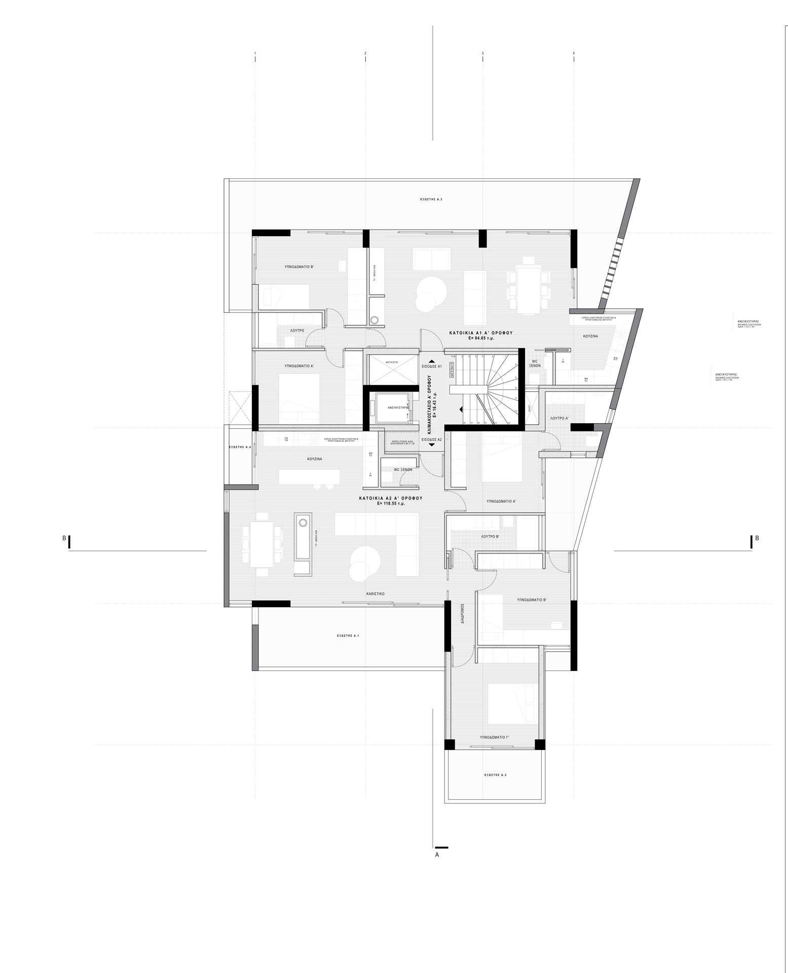 Η κάτοψη οργανώνεται με τις κατοικίες να τοποθετούνται γύρω από τον κατακόρυφο άξονα των κινήσεων. Οι εσωτερικοί χώροι διημέρευσης τοποθετούνται σε άμεση σχέση με τους δρόμους, το πράσινο, τη θέα προς την Πεντέλη και τις υπαίθριες διαμορφώσεις και διευρύνονται οπτικά και λειτουργικά μέσω εκτενών υαλοστασίων με τους προβόλους των εξωστών.