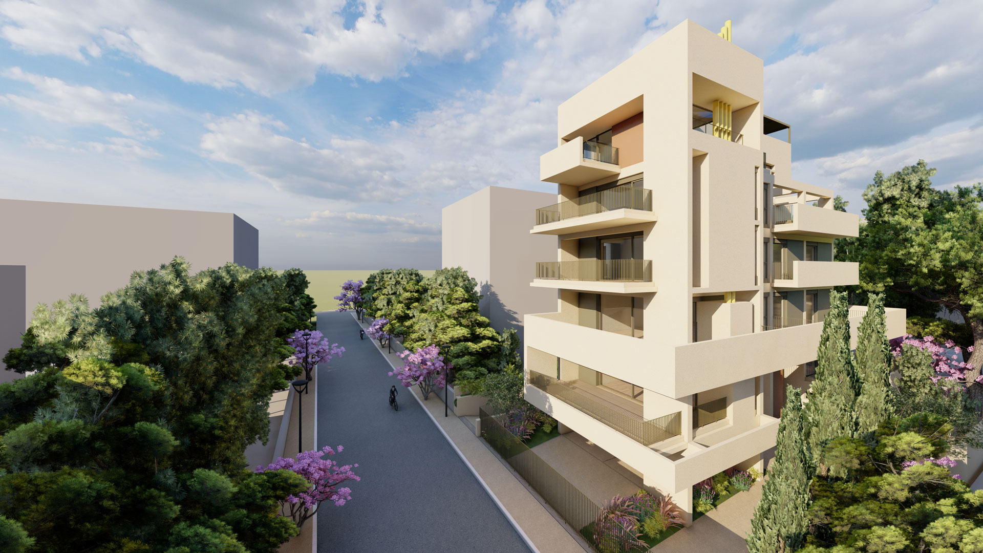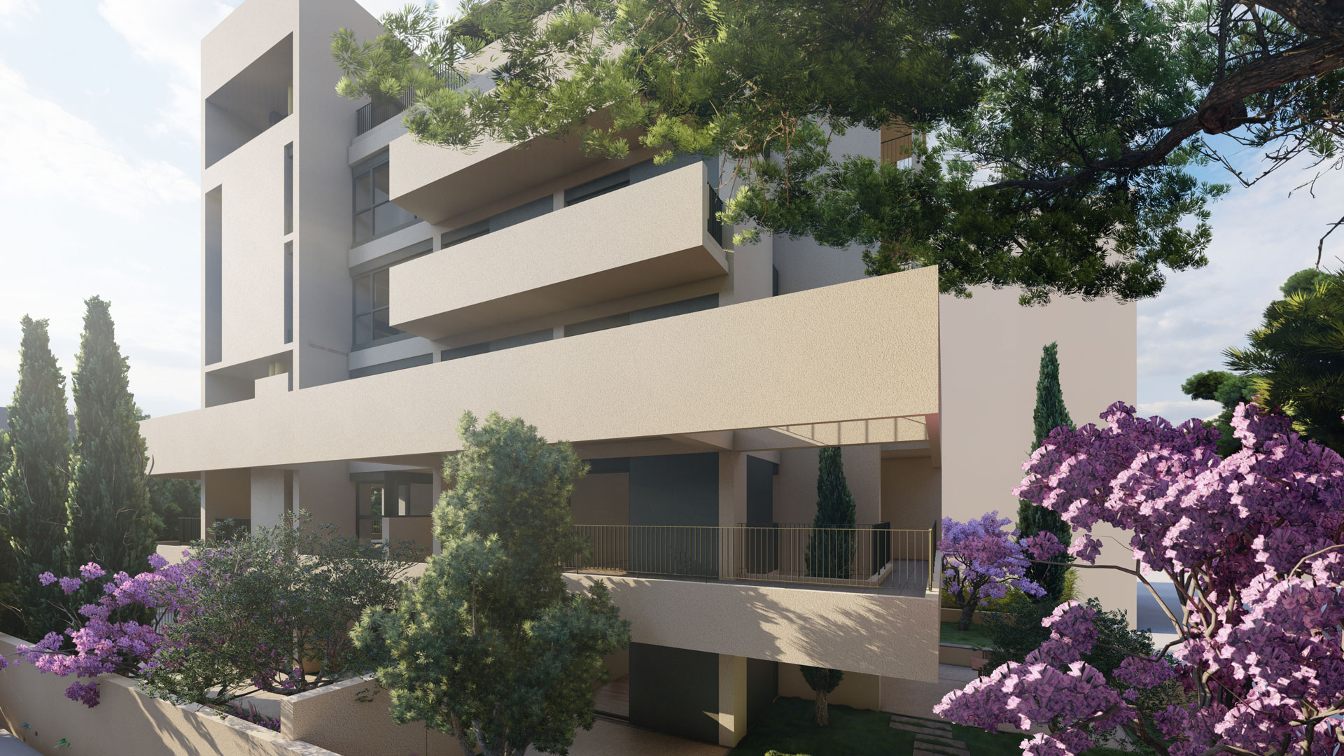 Κεντρική επιλογή αποτελεί η ανάδειξη του υπαίθριου και ημιυπαίθριου χώρου ως βασικού συνθετικού στοιχείου: εξώστες, εσοχές, πέργκολες και φυτεύσεις λειτουργούν ως επέκταση της κατοικίας, ενισχύοντας τη βιοκλιματική της συμπεριφορά. Τα διαμερίσματα στους ενδιάμεσους ορόφους αναπτύσσονται σε ενιαίο επίπεδο, ενώ αυτά του Α’ και Δ’ ορόφου οργανώνονται σε δύο στάθμες, αξιοποιώντας το φυσικό ανάγλυφο και τα δώματα για ιδιωτική εκτόνωση.