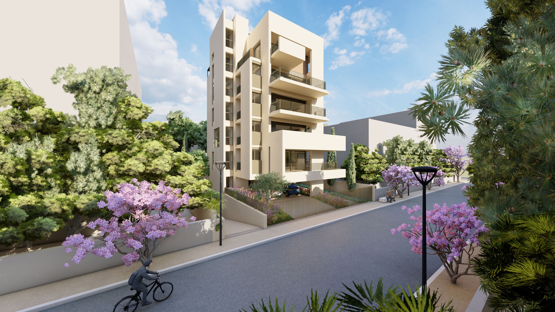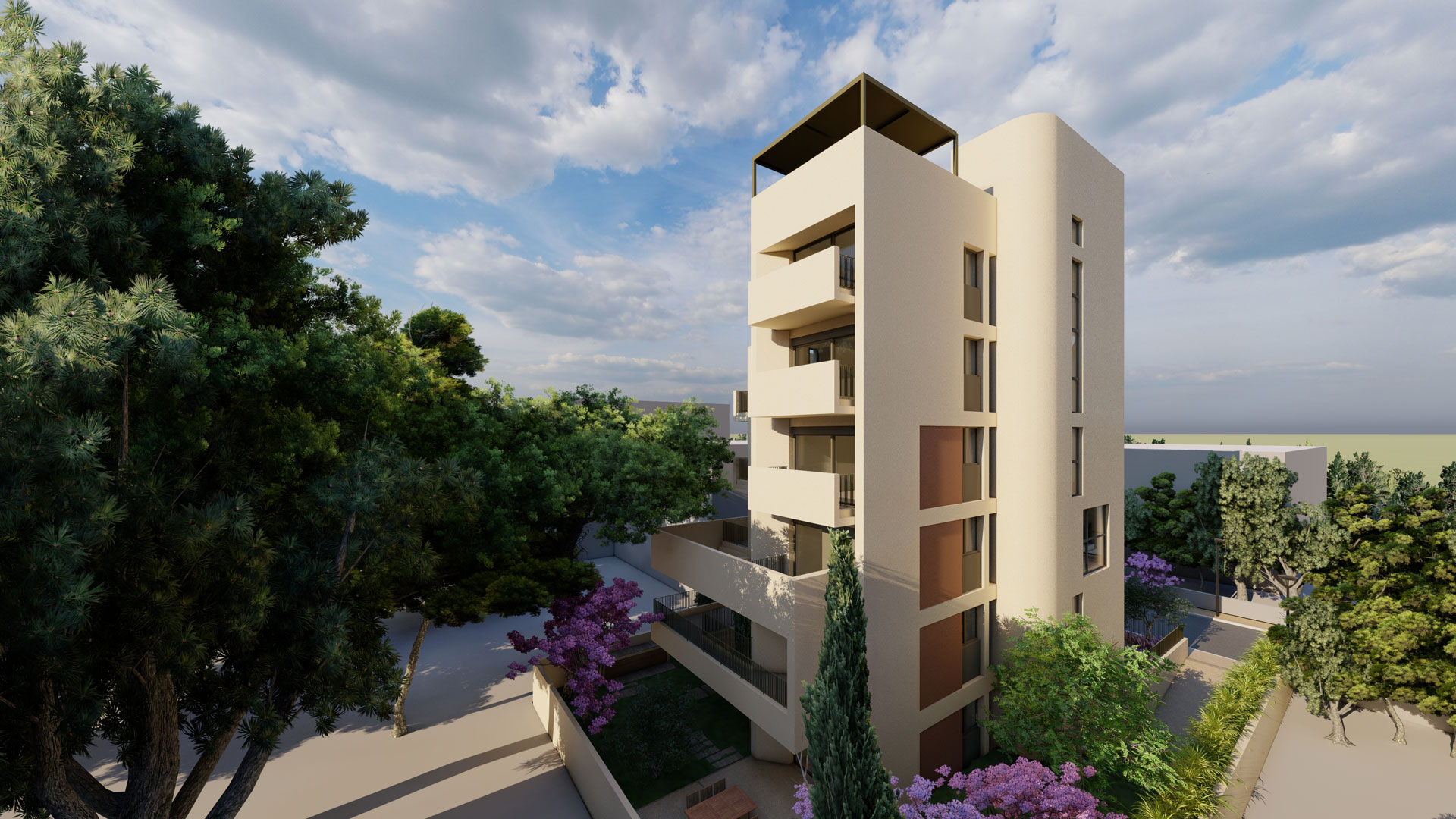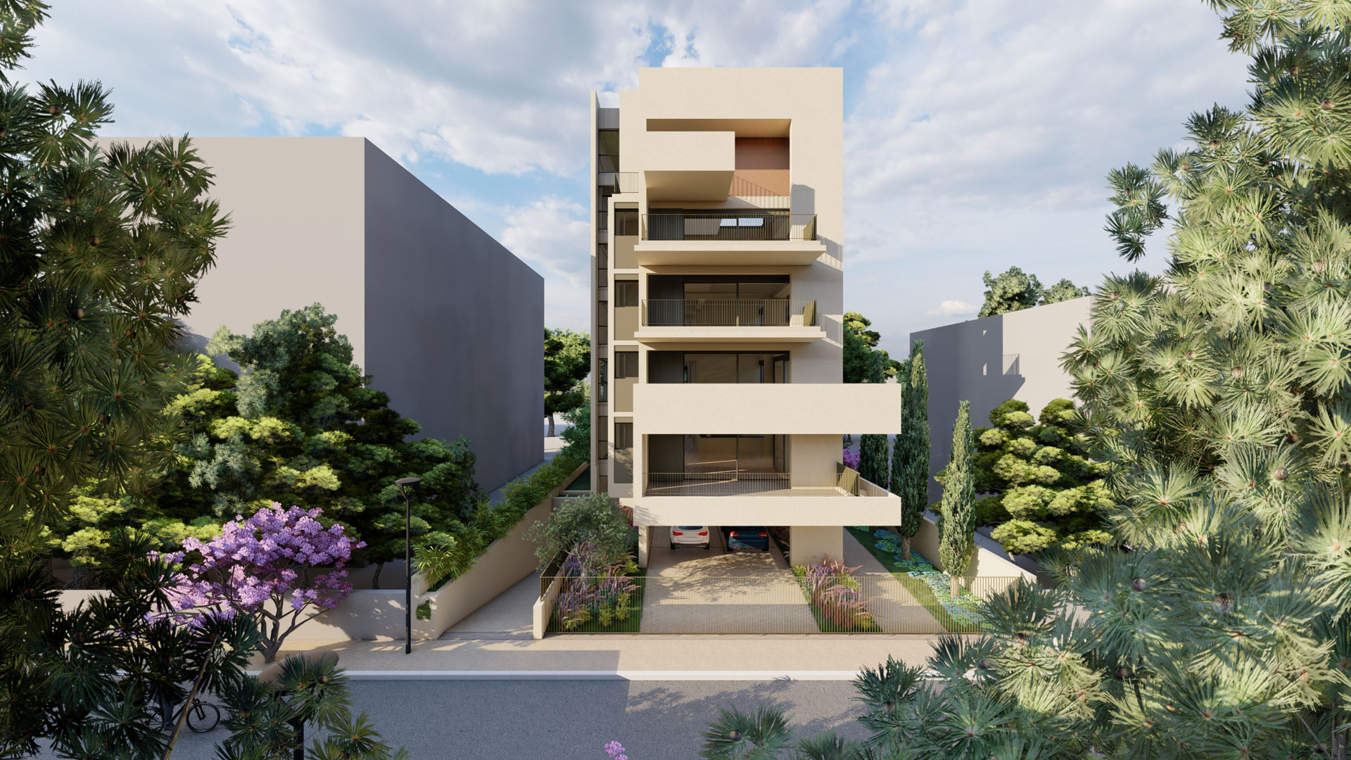 Η πρόταση αφορά στον σχεδιασμό πολυκατοικίας με τέσσερις κατοικίες, εκ των οποίων δύο αναπτύσσονται σε δύο επίπεδα. Η κτιριακή οργάνωση βασίζεται σε ένα αυστηρό γεωμετρικό πρίσμα που τοποθετείται προς τη βόρεια πλευρά του οικοπέδου, αφήνοντας ελεύθερο τον νότο για τη δημιουργία ενός προστατευμένου, ηλιόλουστου κήπου – ζωτικού υπαίθριου χώρου για την καθημερινότητα των κατοίκων.