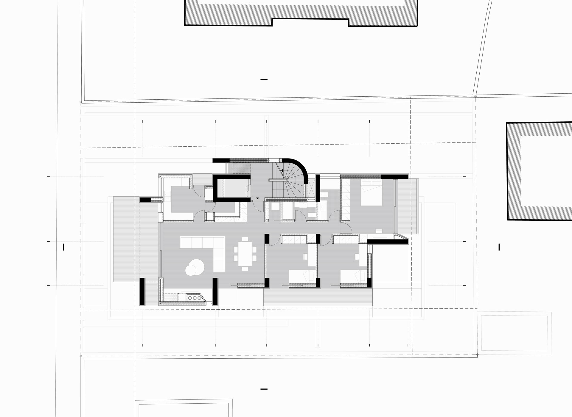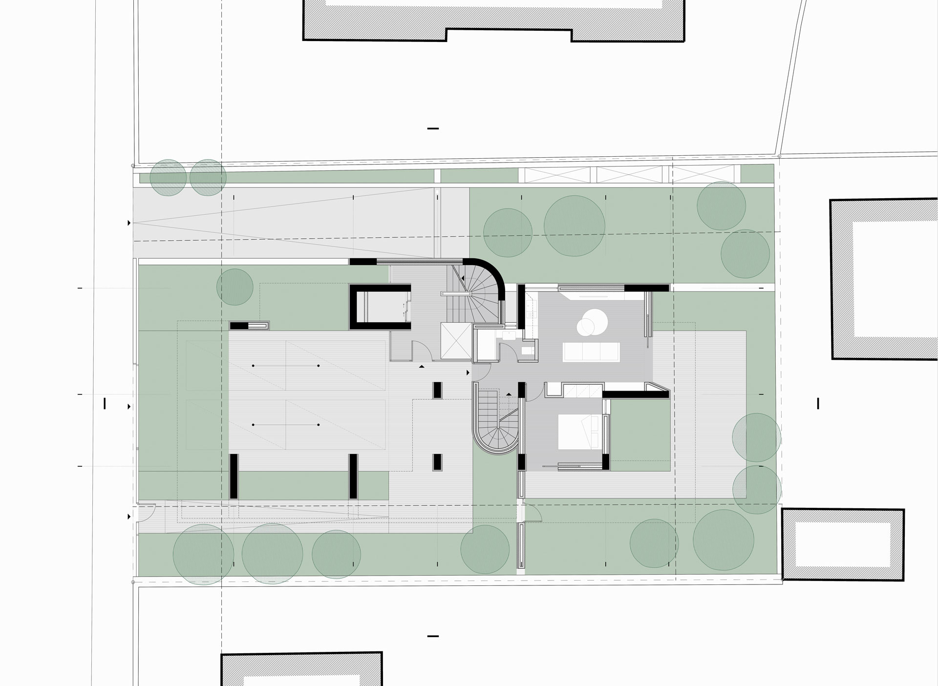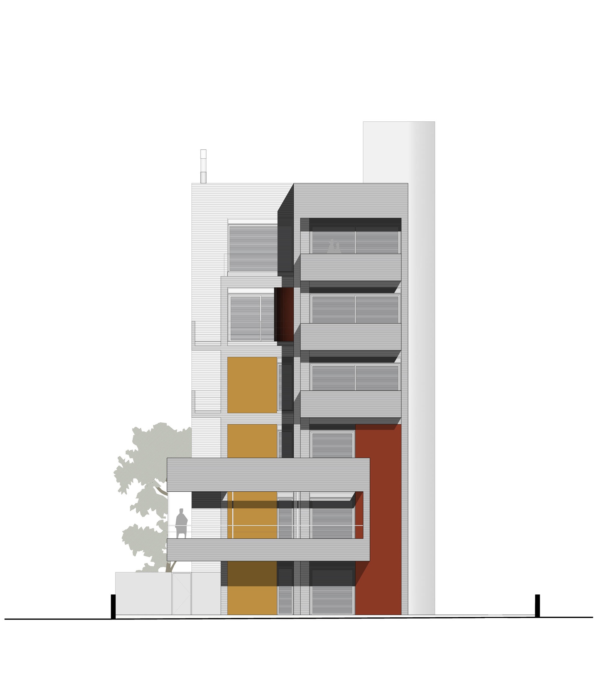 Η πρόταση αφορά στον σχεδιασμό πολυκατοικίας με τέσσερις κατοικίες, εκ των οποίων δύο αναπτύσσονται σε δύο επίπεδα. Η κτιριακή οργάνωση βασίζεται σε ένα αυστηρό γεωμετρικό πρίσμα που τοποθετείται προς τη βόρεια πλευρά του οικοπέδου, αφήνοντας ελεύθερο τον νότο για τη δημιουργία ενός προστατευμένου, ηλιόλουστου κήπου – ζωτικού υπαίθριου χώρου για την καθημερινότητα των κατοίκων.