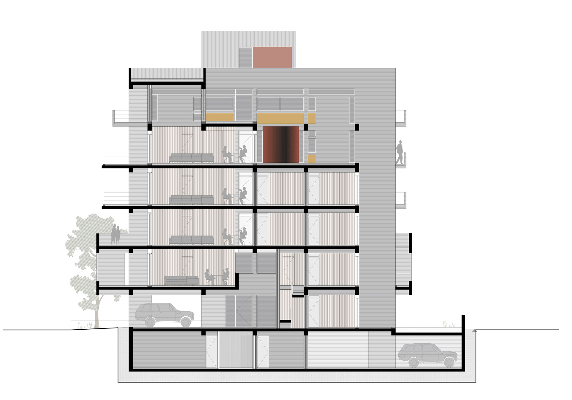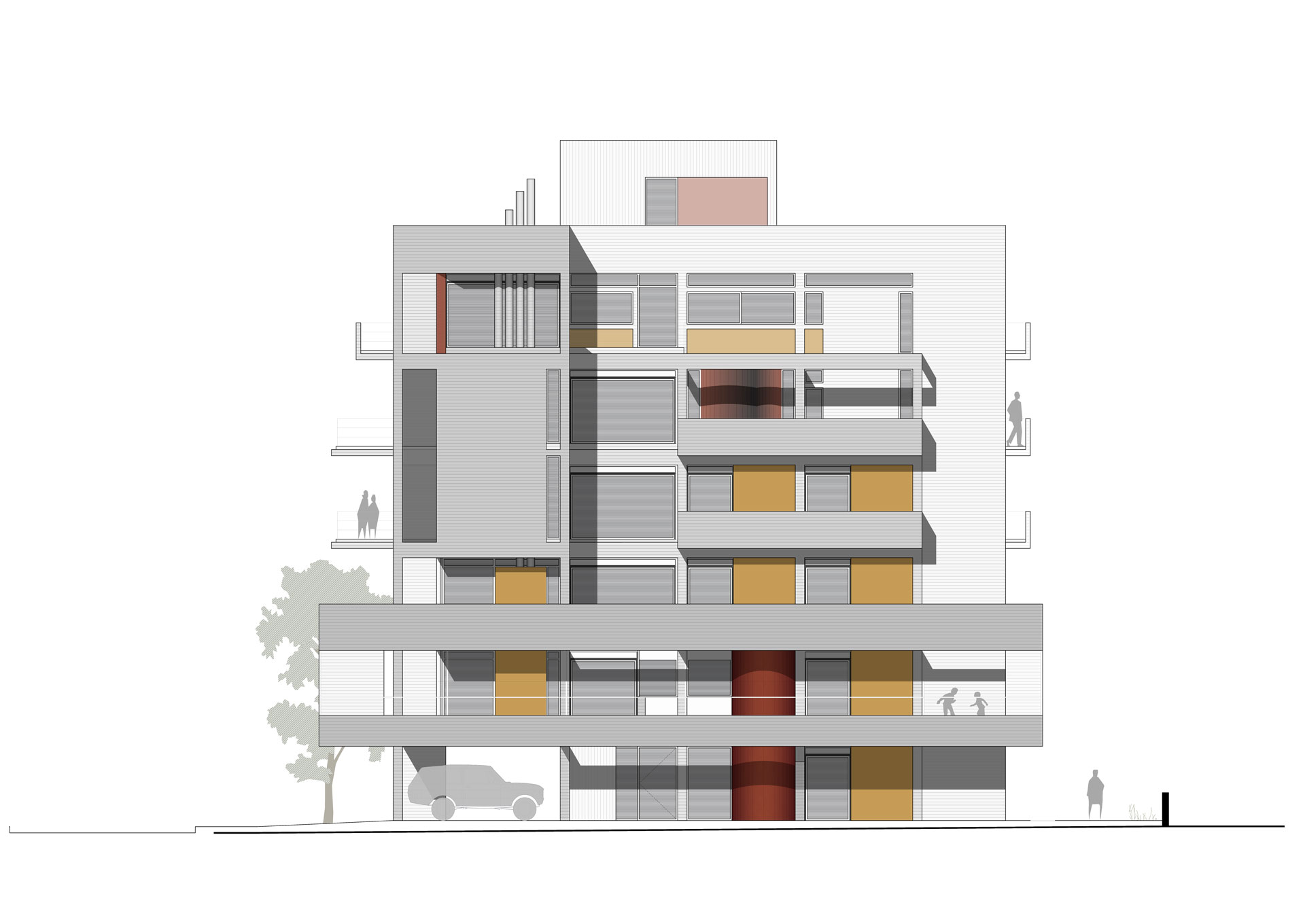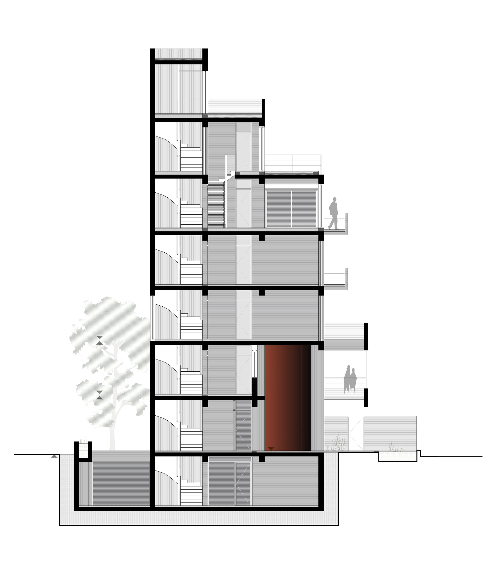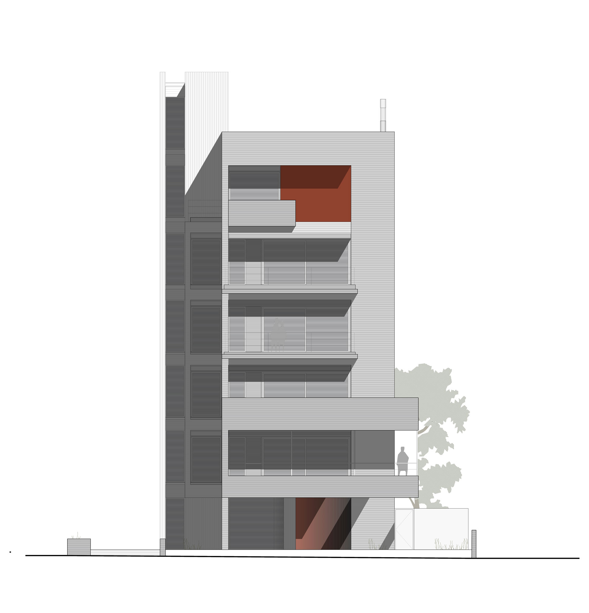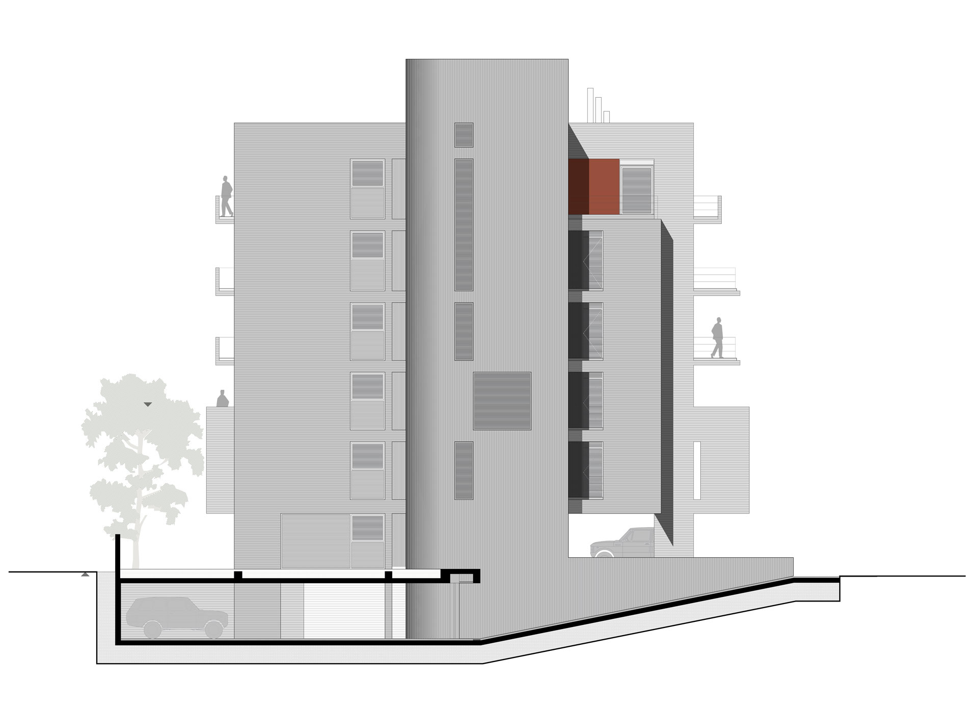 Η ανάπτυξη του όγκου ακολουθεί τον άξονα ανατολής-δύσης και ερμηνεύεται ως μια σύνθεση αρχιτεκτονικών αντιθέσεων (πλήρες-κενό, ανοιχτό-κλειστό), που οργανώνουν την κάτοψη και την τομή. Στο ισόγειο διαμορφώνεται pilotis και κοινόχρηστη είσοδος διπλού ύψους, ενώ στο υπόγειο φιλοξενούνται βοηθητικοί χώροι και χώρος στάθμευσης.